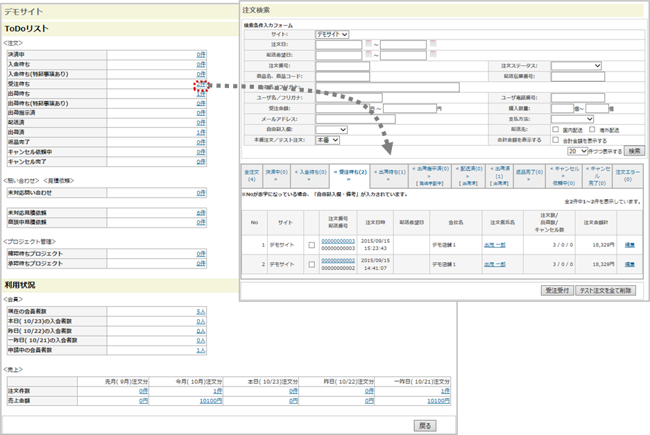 ToDoリスト、利用状況には、それぞれの機能で対応すべき内容の件数や実績情報が表示され、件数などのリンクをクリックすると、選択した情報に該当する画面に遷移します。