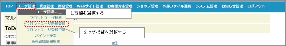 ①ナビゲーションメニューより機能を選択し、サブ機能を選択する。