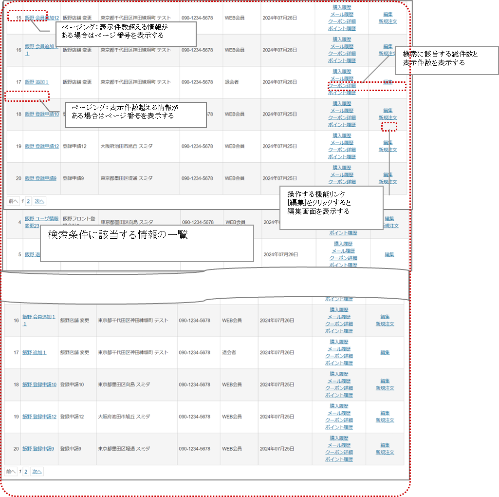 検索結果一覧には、機能に応じて編集、削除などのリンクを表示します。