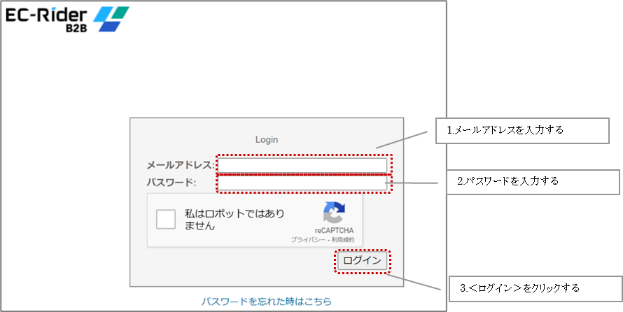 ①管理サイトログイン画面を表示し、[パスワードを忘れた時はこちら]をクリックする。