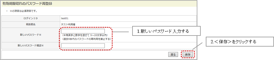 ①新しいパスワードと確認用に新パスワードと同じ内容を入力し、<保存>をクリックします。