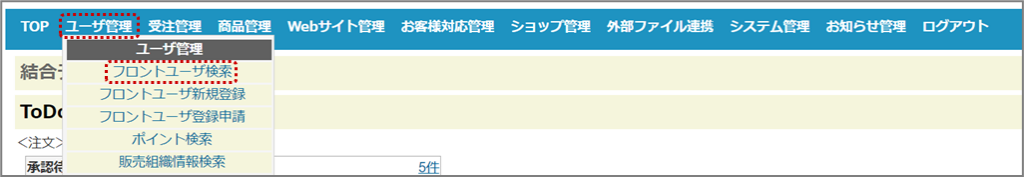①メニューより【ユーザ管理-フロントユーザ検索】を選択する。