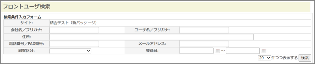 ②フロントユーザ検索画面が表示されるので、必要に応じて検索条件を入力して<検索>をクリックする。