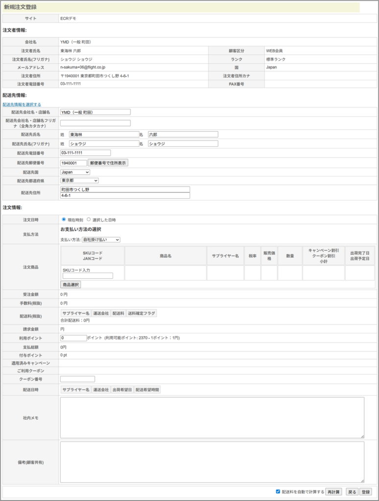 ④新規注文作成画面が表示される。