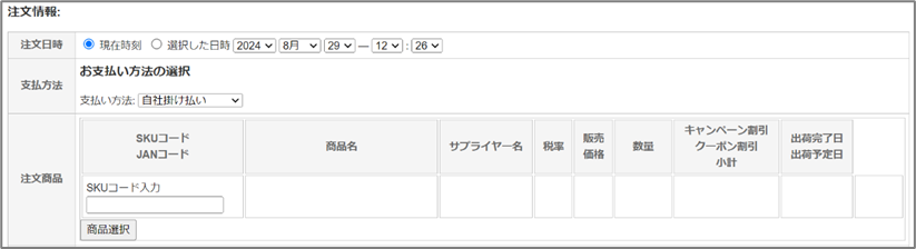 | 注文日時 | 注文日時を現在時刻にするか選択した日時にするか選択します。 |
