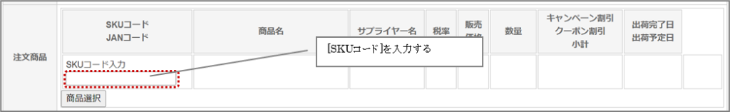 [SKUコード入力]にSKUコードを入力するか、[商品選択]をクリックする。