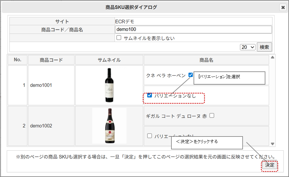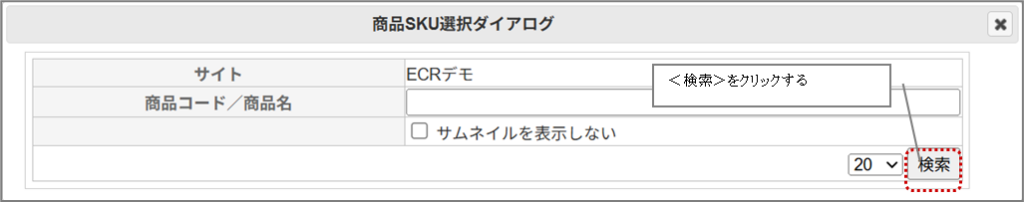 ①商品 SKU選択ダイアログが表示されるので、必要に応じて検索条件を入力して<検索>をクリックする。
