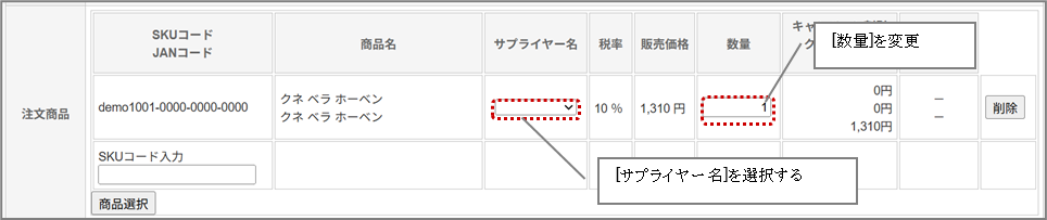 [サプライヤー名]を選択し、[数量]を変更する。
