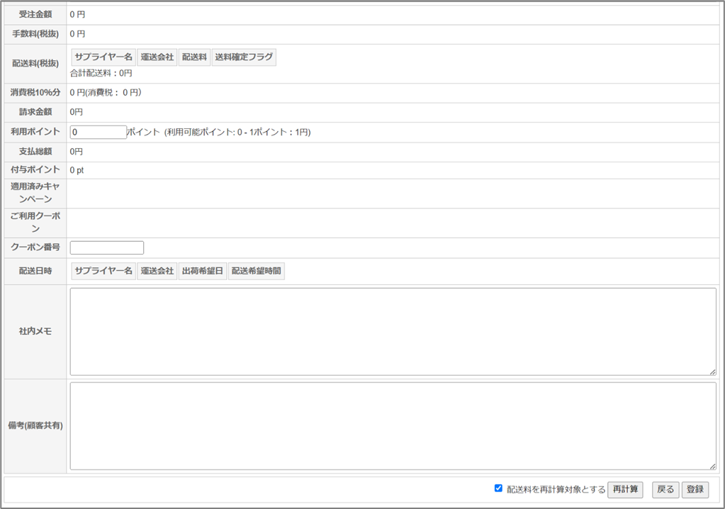| キャンペーン割引 クーポン割引 小計 | 商品にキャンペーン等で割引が設定されている場合にその割引金額を表示します。 小計(単価×注文数-(割引+クーポン))を表示します。 |