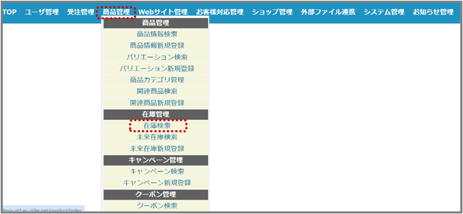 ①メニューより【商品管理-未来在庫検索】を選択します。