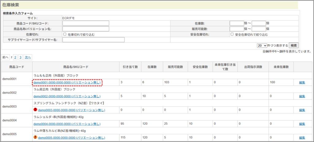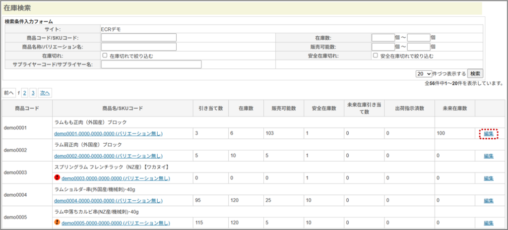 ③在庫検索一覧より、在庫編集する商品SKUの<編集>をクリックします。
