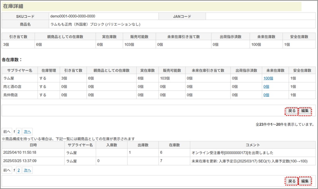 ④在庫詳細画面が表示されますので在庫検索一覧に戻る場合は<戻る>を、編集を行う場合は<編集>をクリックします。