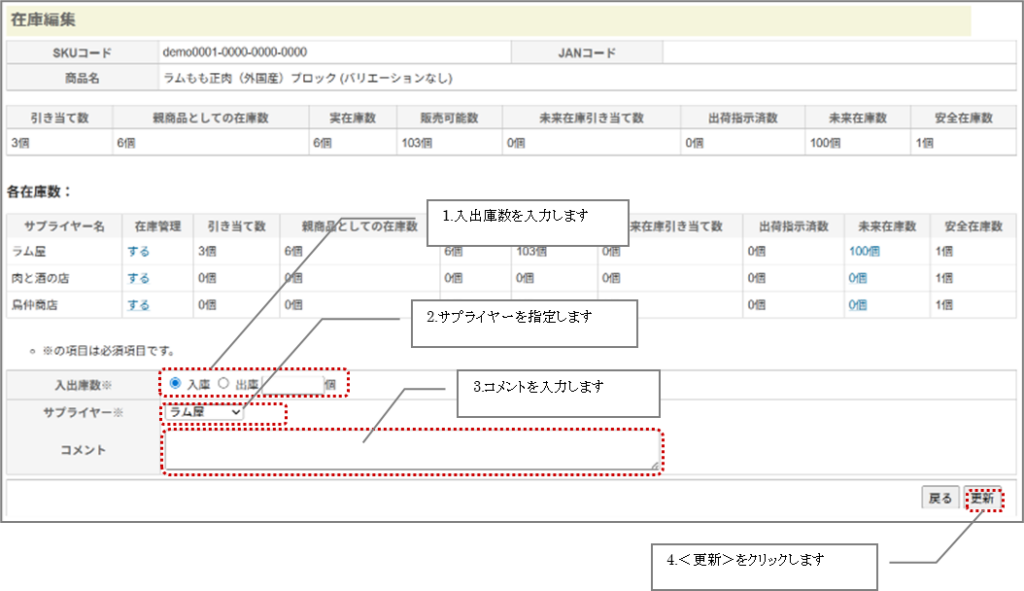 ④在庫編集画面が表示されるので、必要項目を入力して<更新>をクリックする。