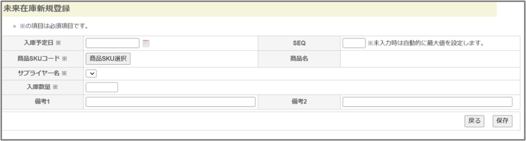 備考1,2              未来在庫に対する備考を100文字以内で入力します。