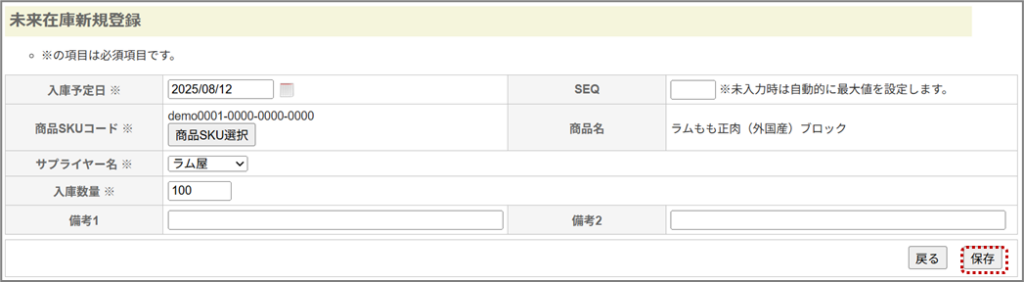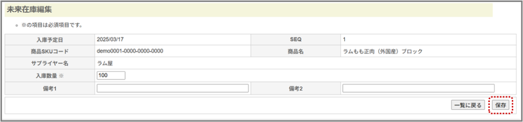 ④未来在庫編集画面で必要項目を入力したら<保存>をクリックします。編集できる項目は入庫数量、備考のみとなっております。