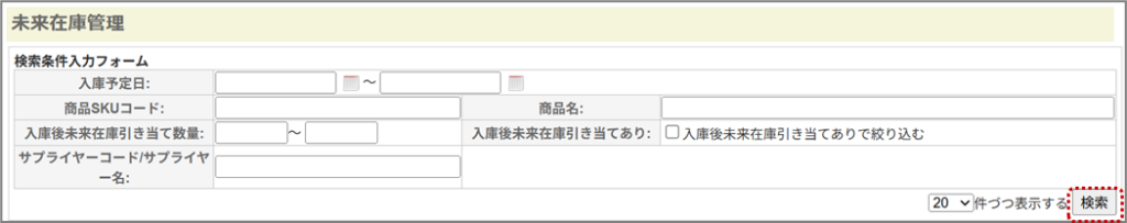 入庫後未来在庫引き当て数入庫後未来在庫引き当て数を入力します。検索開始個数~検索終了個数を入力することで範囲指定することができます。