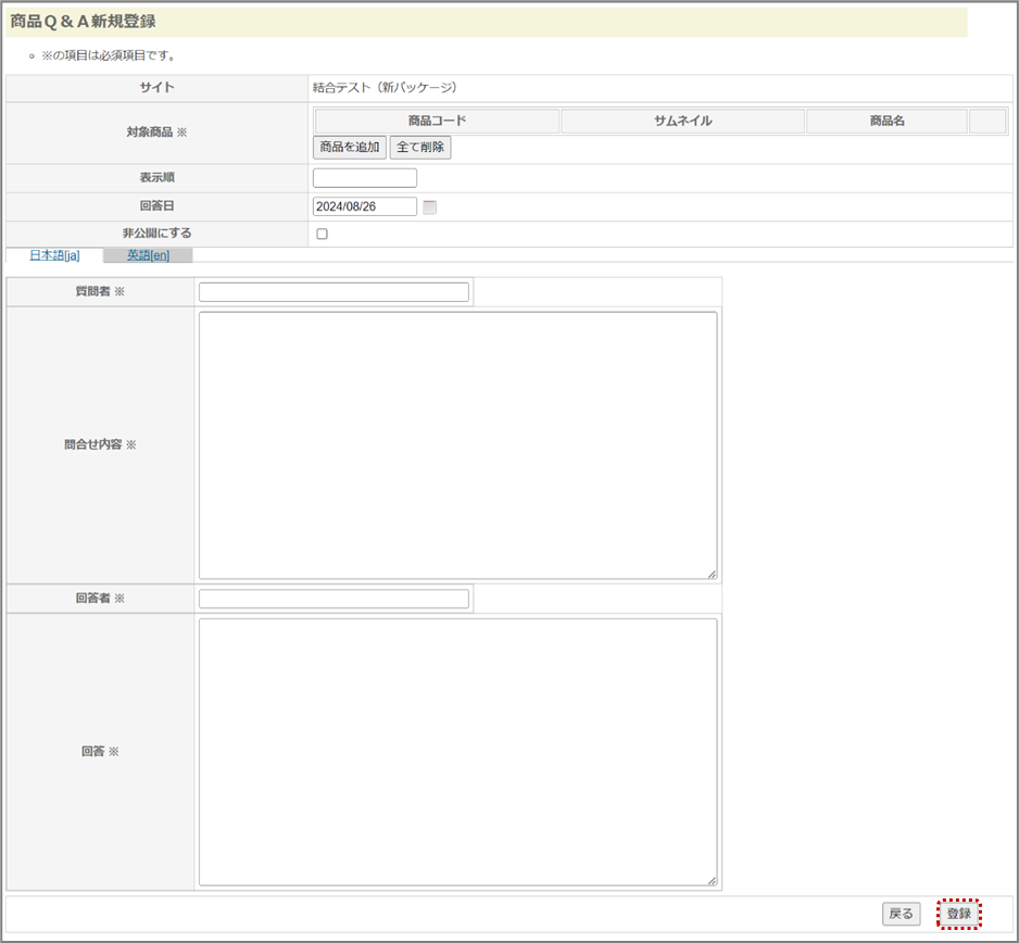 ②商品Q&A新規登録画面が表示されるので、必要項目を入力して<登録>をクリックする。