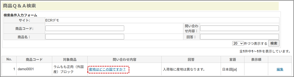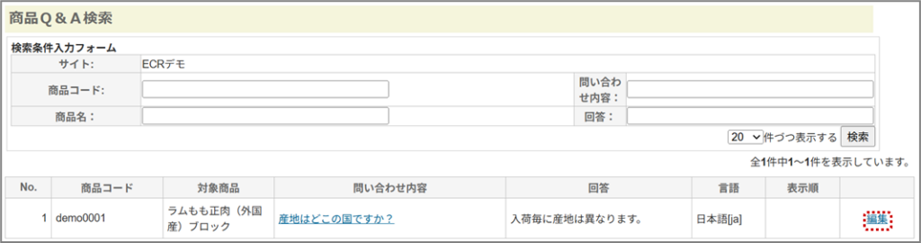 商品Q&A新規登録で作成した内容を参照、編集、削除ができます。