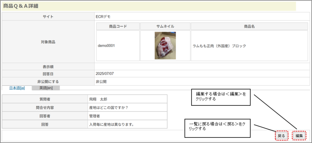 ④商品Q&Aの詳細画面が表示されるので、お問い合わせ内容を参照後、編集する場合は<編集>を③の商品Q&A検索一覧に戻る場合は<戻る>をクリックする。