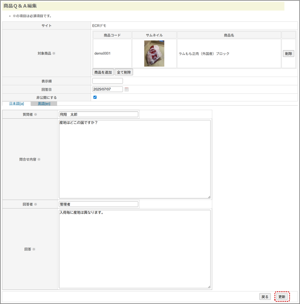④商品Q&A編集画面が表示されるので、必要項目を設定して<更新>をクリックする。
