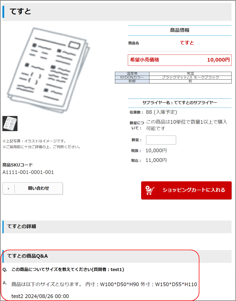⑤商品Q&Aで回答した内容がフロントサイトの商品詳細で表示される。