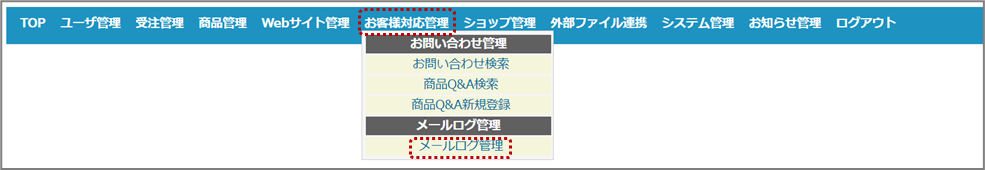 ①メニューより【お客様対応管理-メールログ検索】を選択する。