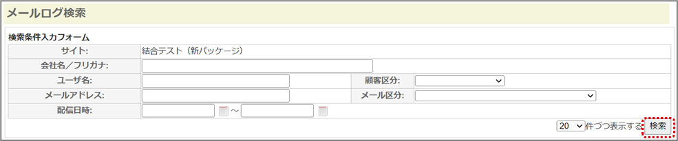 ②メールログ検索画面が表示されるので検索条件を入力して<検索>をクリックする。