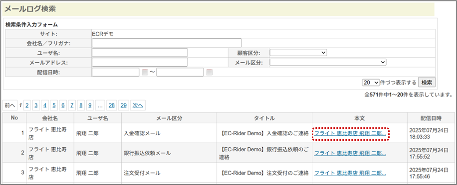 ③配信済みメール検索一覧より参照するメールの[本文]をクリックする。
