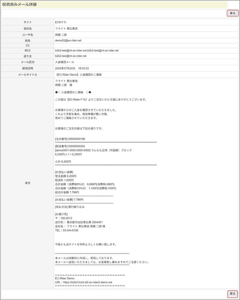 ④配信済みメール詳細画面が表示される。配信済みメールを参照後、<戻る>をクリックする。