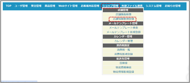 ①メニューより【ショップ管理-店舗情報新規登録】を選択します。