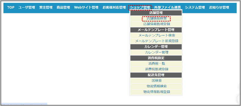 ①メニューより【ショップ管理-店舗情報検索】を選択します。
