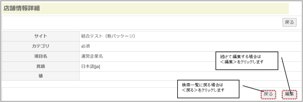 ④店舗情報詳細画面が表示されるので、確認後<戻る>をクリックする。