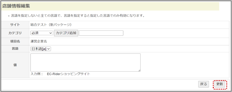 ④店舗情報編集画面が表示されるので必要項目を入力して<更新>をクリックします。
