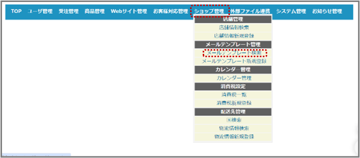 ①メニューより【ショップ管理-メールテンプレート検索】を選択します。