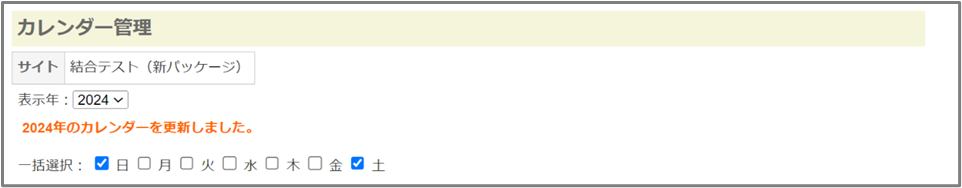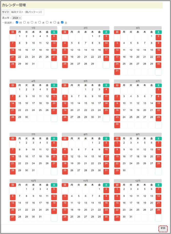 ②カレンダー管理画面が表示されるので、休日を選択し、<更新>をクリックします。