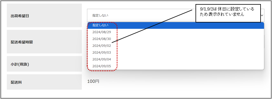 なお、休日に選択した日付はフロントサイトのお届け先お支払方法指定の画面での出荷希望日に表示されなくなります。
