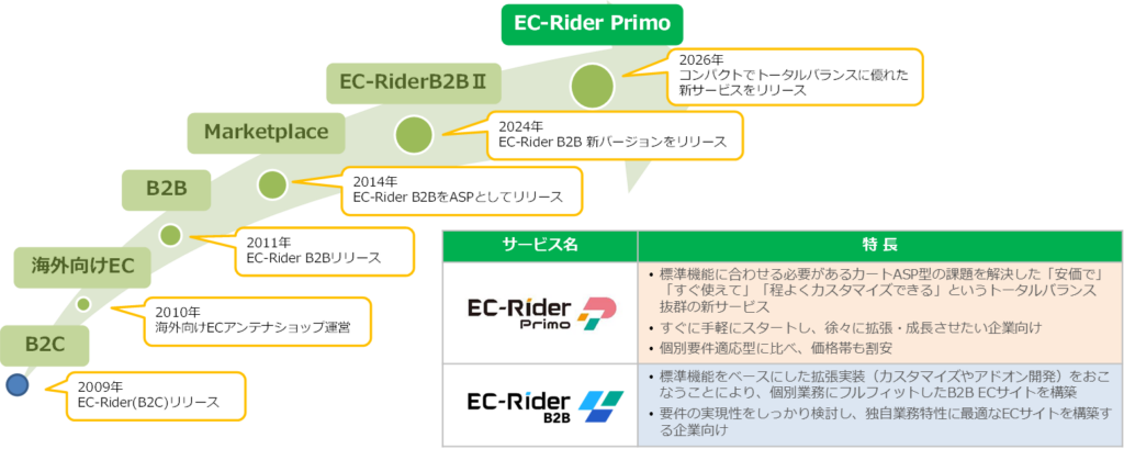 現在は、最新技術の反映をはじめ、強みであるBtoBに特化した機能についての更なる強化、モダンな性能、強固なセキュリティ性能を実装したEC-RiderB2BⅡを最新バージョンとしてサービス提供しておりますが、新たに「安価で」「すぐ使えて」「トータルバランス抜群」の新サービスEC-Rider Primoをリリースしました。